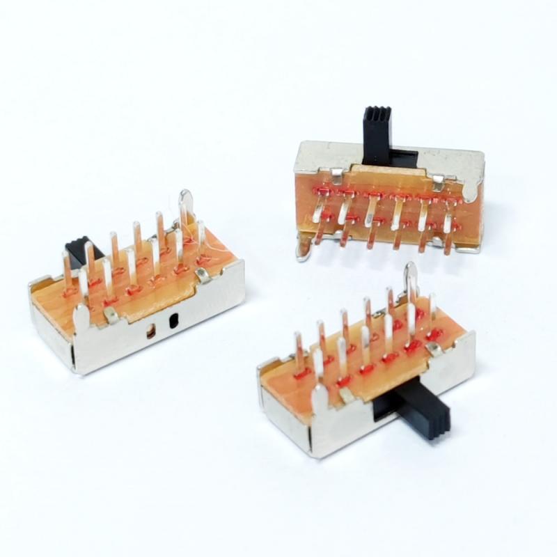 El interruptor deslizante 4P2T controla simultáneamente cuatro circuitos independientes con dos estados de conmutación estables, lo que permite una selección eficiente de circuitos de múltiples rutas en aplicaciones compactas.