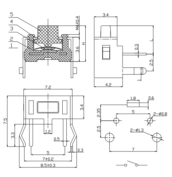 Mini interruptor táctil de 7,2 mm x 3,4 mm con soporte
